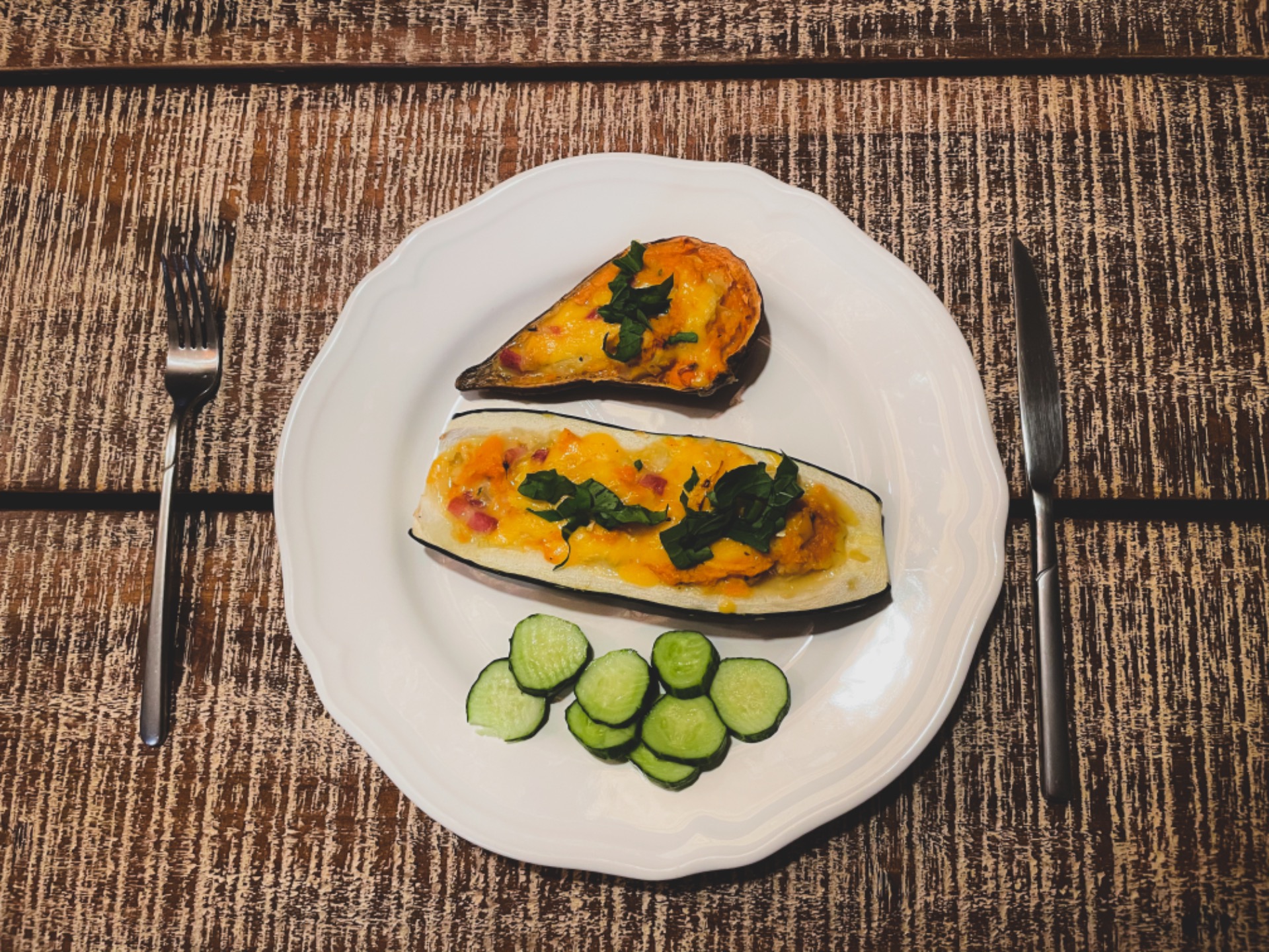 Na panvičke si na troche olivového oleja orestuj slaninku s cibuľou. Keď už bude cibuľka sklovitá pridaj aj vnútro z cukiet. Restuj ešte 2 minútky a všetko spolu daj do misky. Pridaj vajíčka, soľ (použila som aj trochu bylinkovej soli), čierne korenie a na špičku lyžičky kurkumi (veľmi rada používam zmes Power Tumeric od Powerlogy). Všetko dobre zmiešaj.