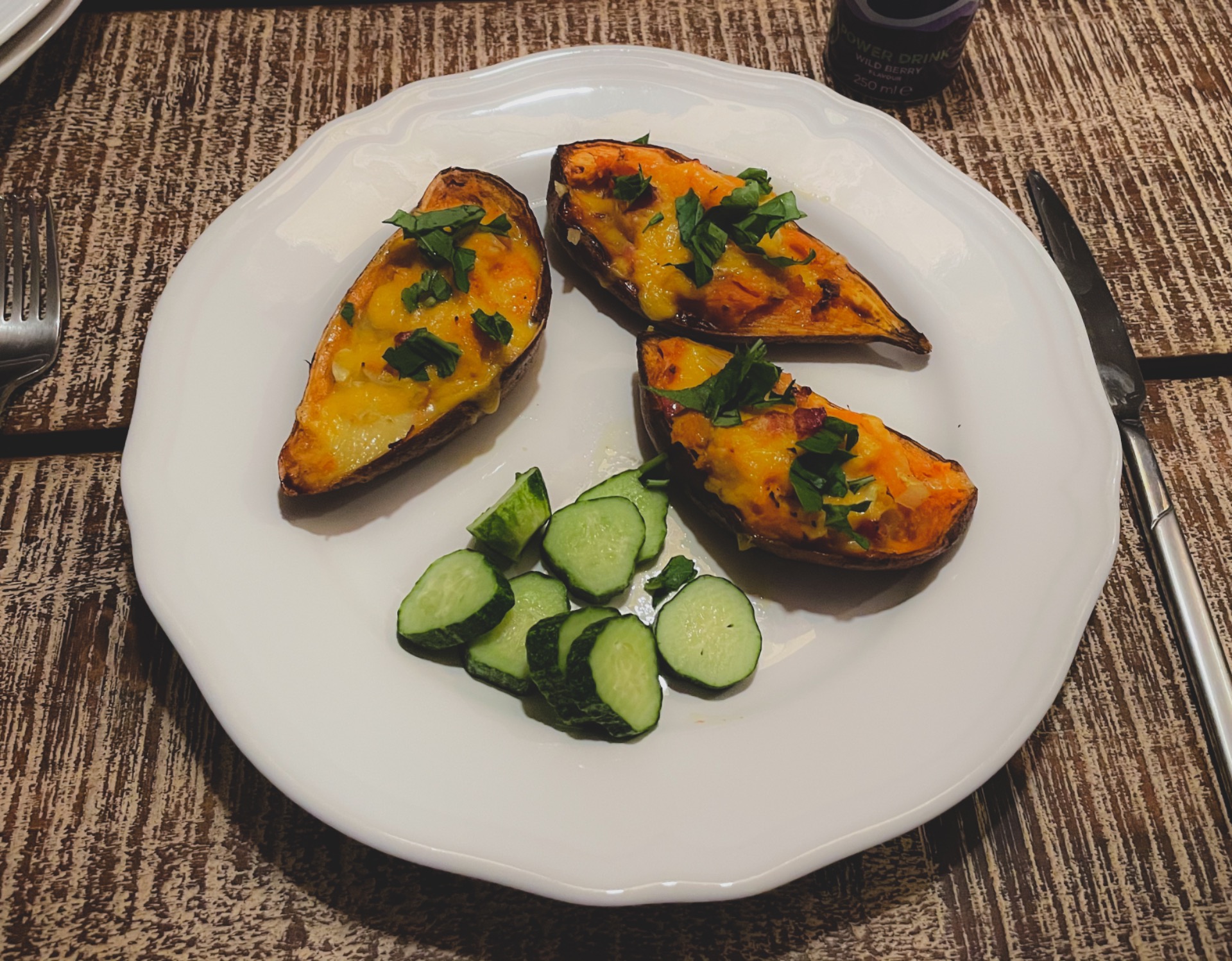 Keď sa batáty upečú, vydlab z nich vnútro, pridaj k pripravenej zmesi, trochu popuč a ešte raz všetko dobre premiešaj. Takto pripravenú zmes plň do batátových šupiek a do vydlabaných cukiet. Daj piecť ešte na 15 minút a 2 minúty pred koncom posyp syrom cheddar. Pre seba som použila Cheddar od Violife, ak ti chutí pokojne si ho pridaj. Sú však skvelé aj bez neho. Po vytiahnutí z trúby posyp ešte trochu rukolov. Výborne sa k tomu hodí :)